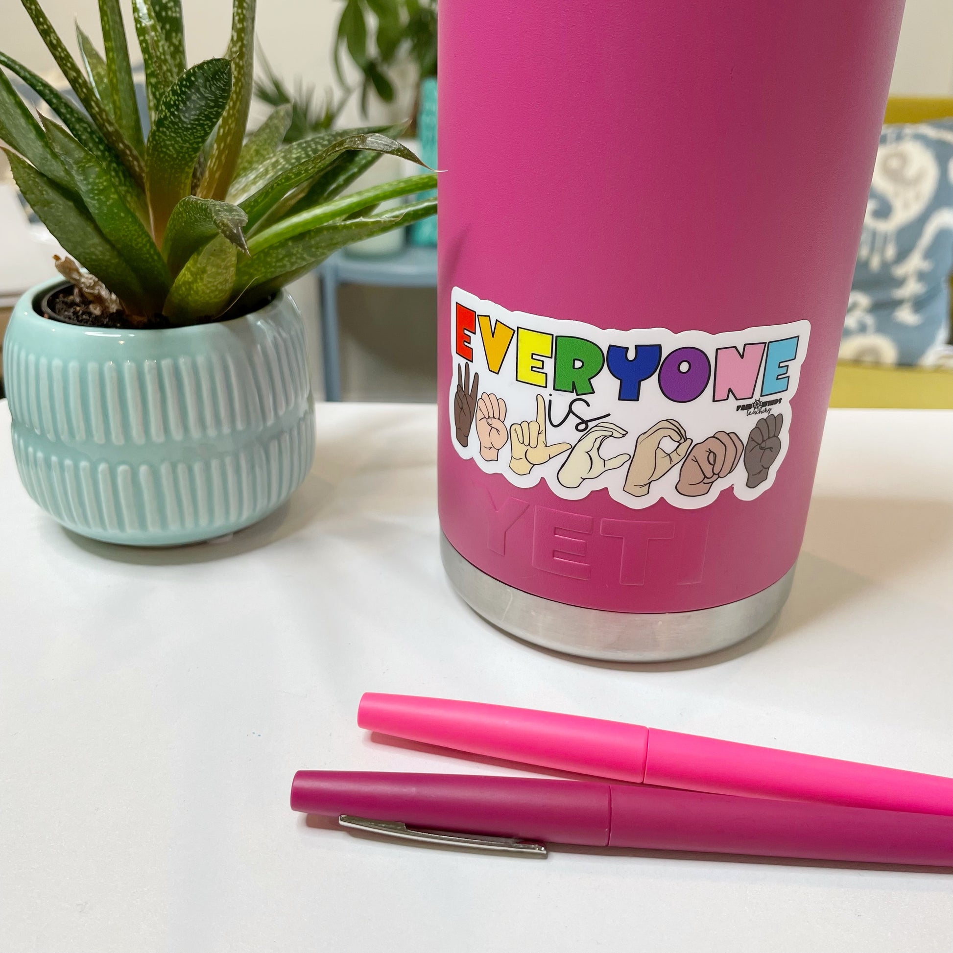 The sticker is die-cut with dimensions of 3" x 1.59". It is water resistant and more importantly, promotes inclusion with vibrant colors of the rainbow proudly displaying "Everyone" lettering! After "is", the lettering "Welcome" is spelled in ASL through multicolored tones to celebrate diversity and love for all!