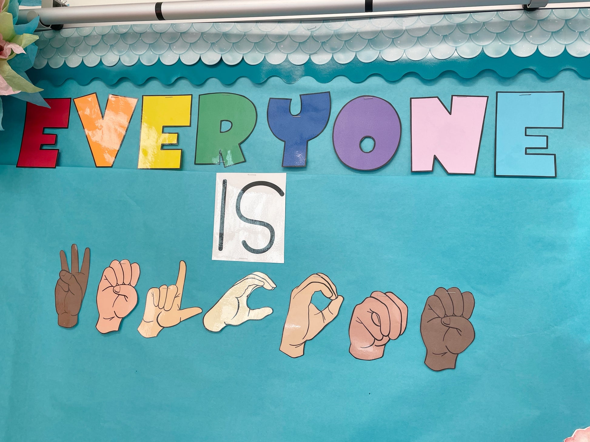 The lettering includes "Everyone" in vibrant colors of the rainbow, along with "is" in black lettering (Astro Bright Paper), and "Welcome" spelled in ASL through multicolored tones to celebrate diversity and love for all!