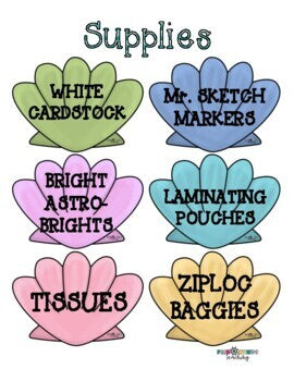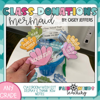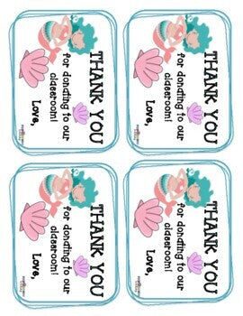 Grab a sand bucket and fill it up with some sand, then simply print these shells with school supplies out and glue them on popsicle sticks. Stick them in the sand and hang up the mermaid sign. Place this outside your classroom during your back to school night or conferences to ask for donations. When you receive donations, send home one of the thank you notes as a last reminder on how grateful you are. Enjoy!