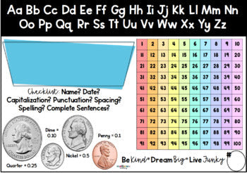 ☞ Includes the alphabet, hundreds chart, coins, name, reminder about completing their best work, motivational quote, and classroom number