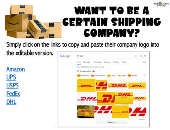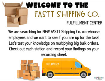 Transform your math class into an Amazon or FedEx or USPS shipping warehouse! Everything you need for a multiplying 2 digit by 2 digit and 1 digit by 4 digits day of packing and shipping orders! Customize by adding your favorite shipping store (there are no trademarked logos in the pack for sale, but an editable version for you to make your own) or use my fake company called, FASTT Shipping Co.! You also have access to links to purchase supplies to make it the most interactive day!