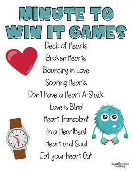 Grab a one-minute timer and have some fun. The directions and materials needed to play 10+ different Valentine's Day themed Minute to Win it games! Love is in the air!