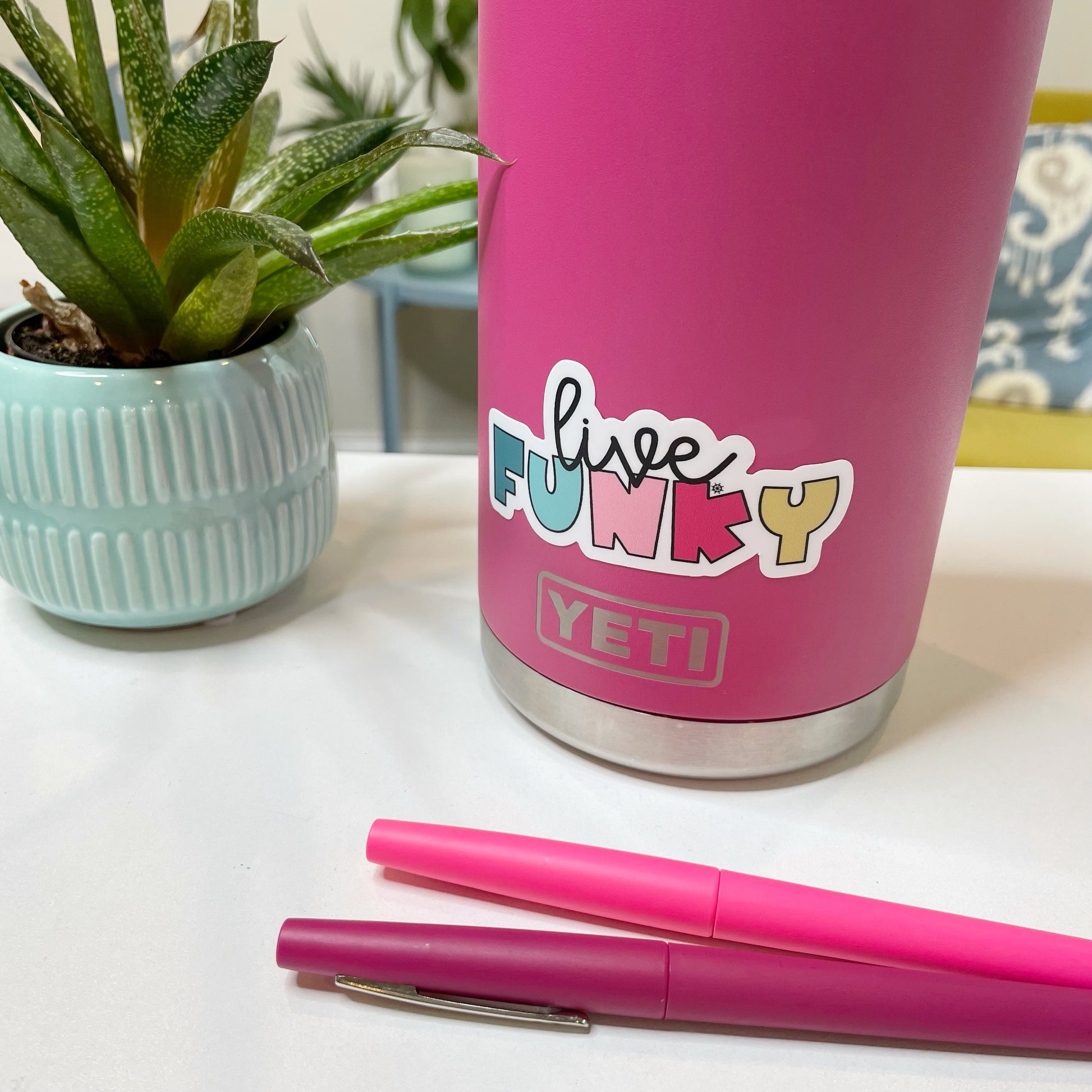 Bring your water bottles, laptops, notebook and more to life with the "Live Funky" vinyl sticker!